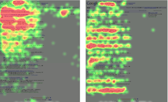For example, figure 1 shows a heat map from usability testing with an eye-tracker on the Google homepage. As can be clearly seen a gaze plot provides quantitative data and can be used to enumerate the number, and path, of fixations on page. In this example the first user quickly scans the page and then returns to the top, whilst the second user scans every item in detail, scrolling down the page. Descriptive statistics can be generated and analysed from this type of fixation data.