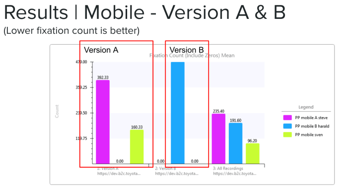 The results on the left in figure 6 show the mean fixation count for each participant in the defined areas of interest, the areas of interest are defined as the expanded page on version A and the collapsed version with accordions on version B. The software automatically calculates number of saccadic fixation count within those defined areas. We can also generate different descriptive statistics within the software such as tine unto first fixation.