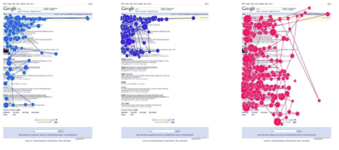 Similarly eye-tracking can be very useful in determining user behaviour in a granular way which would not be possible simply by speaking to a participant. Figure 2 shows a gaze plot from a similar usability test on the Google homepage. As can be clearly seen a gaze plot provides quantitative data and can be used to enumerate the number, and path, of fixations on page. For example, the first user quickly scans the page and then returns to the top, the second doesn’t go below the fold and chooses a video, whilst the third user scans every item in detail. Again, descriptive statistics can be generated and analysed from this data providing useful charts and graphs for analysis.