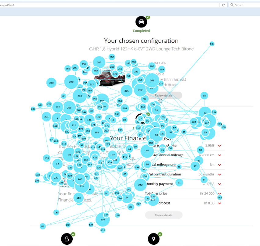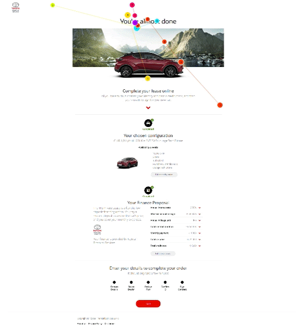 I worked with Toyota Financial Services to lead the research on their car purchase checkout process within Norway, which were the stages that directly followed on from a user configuring a vehicle before they purchased their vehicle outright or arranged finance. One prototype already existed though this had not been designed to account for cultural specificities within Norway and it was known there were issues with a particular page, namely the Review Plan page, therefore I provided cultural design guidance and planned a (between-subjects) usability test which would compare the usability of each version.