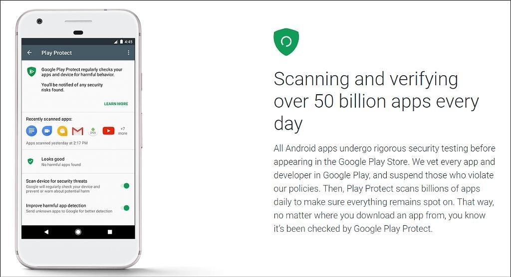 Google Play Protect is software integrated into every Android device, making it the most widely deployed mobile threat protection service in the world. It secures 2 billion Android users, and scans and verifies more than 50 billion apps daily.